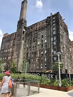 In 2007, three buildings of the Domino Sugar Refinery were also designated New York City Landmarks. The original refinery was built in 1856, and by 1870 processed more than half of sugar used in the United States. A fire in 1882 caused the plant to be completely rebuilt in brick and stone; these buildings exist today, though the refinery stopped operating in 2004.[55] In 2010, a developer proposed to convert the site to residential use;[56] since them, a new plan was approved for the Domino Sugar Factory, led by Two Trees Management.[57]