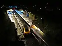 The station at night: a CrossCountry service to York passing a South West Trains service to Weymouth