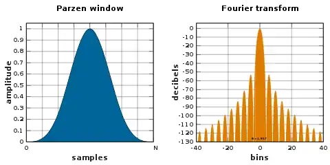 Defining L ≜ N + 1, the Parzen window, also known as the de la Vallée Poussin window,[16] is the 4th-order B-spline window given by: