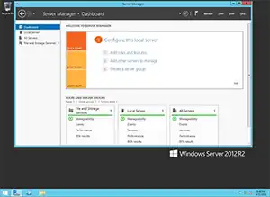 Screenshot of Windows Server 2012 R2, showing the Server Manager application which is automatically opened when an administrator logs on, start button, taskbar, and the blue color of Aero Lite