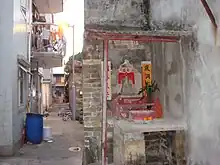 Wing Ning Wai is said to have a history dating back 400 to 500 years. It historically comprised three rows of houses enclosed within a rectangular protective wall, with an entrance gate in the north-east front wall and four watchtowers at its four corners. While the entrance gate, built in 1744, is still extant, the watchtowers and most of the enclosing walls have been demolished. Some of the watchtowers had new buildings constructed on them. The altar situated at the end of the main alley has disappeared.[5][6]