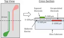 Top and cross-sectional schematic of microscale dielectric barrier discharge plasma actuator.