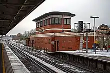 The track through Woking station was quadrupled in 1904 and electrified in 1937.[17] The station was rebuilt by the Southern Railway in the Art Deco "Odeon" style in 1936–37. The signal box, which was constructed as part of the rebuilding programme, is a Grade II listed building.[2][1][18]