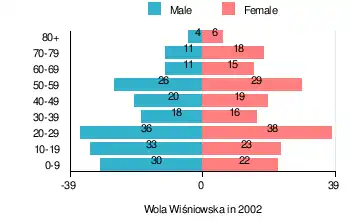 According to the 2002 Poland census, there were 375 people residing in Wola Wiśniowska village, of whom 50.4% were male and 49.6% were female. In the village, the population was spread out, with 25.3% under the age of 18, 38.4% from 18 to 44, 20.8% from 45 to 64, and 15.5% who were 65 years of age or older.[1]