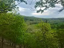 The Woodstock Tower, built in 1935 by the Civilian Conservation Corps, is located on a 2000 ft mountain that overlooks the town.[47] The tower is a popular sightseeing attraction, providing panoramic views of the valleys on either side and of the seven bends of the North Fork of the Shenandoah River. In March 2019, a portion of the road leading to the tower crumbled due to erosion. The road received $350,000 worth of repairs by Virginia Department of Transportation.[48] The road re-opened again in November 2019.