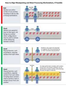 Meat and poultry processing facilities have work environments that may contribute substantially to their potential exposures, as they often work close to one another on assembly lines during prolonged work shifts. For engineering controls, CDC and OSHA recommend configuring communal work environments so that workers are spaced at least six feet apart including along processing lines, using physical barriers such as strip curtains or plexiglass to separate workers from each other, and ensuring adequate ventilation that minimizes air from fans blowing from one worker directly at another worker. For administrative controls, they recommend staggering workers' arrival, break, and departure times, cohorting workers so they are always assigned to the same shifts with the same coworkers, encouraging single-file movement through the facility, avoiding carpooling to and from work, and considering a program of screening workers before entry into the workplace and setting criteria for return to work of recovered workers and for exclusion of sick workers. For personal protective equipment, they recommend face shields and considering allowing voluntary use of filtering facepiece respirators such as N95 masks. They also recommend wearing cloth face masks that should be replaced if they become wet, soiled, or otherwise visibly contaminated during the work shift, although cloth face masks are not considered to be personal protective equipment.[5]
