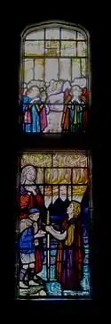 In the right-hand window, Mr Valiant hands on the sword to one of the schoolboy pilgrims. In the background Hallward depicts the Holy City ("Celestial City") with myriad angels grouped about it, one blowing a trumpet. The "Holy City" window includes a fragment of glass from the ruined Cathedral at Ypres. The fragment was a donation from Sir Francis Lloyd of Rolls Park, who was a school governor and had fought in the Great War. The then headmaster, E.H.S. Walde told the artist to "strengthen the boys’ knees" (Isaiah 35:3 – "Strengthen the weak hands and make firm the feeble knees").[14]