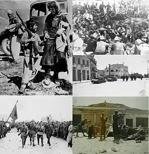 ![]() Clockwise from top left: Albanian refugees crossing the border to Yugoslavia in April 12, 1939, Ballists and Communists converse during Mukje Agreement 1943, Italian troops in Durrës, Communist Partisans fighting in Tirana 1944, Partisans march through Tirana after occupying it 28 November 1944 | ||||||||