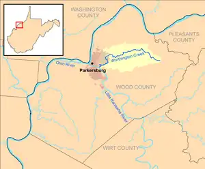 Worthington Creek is a tributary of the Little Kanawha River, 15.4 miles (24.8 km) long,[3] in western West Virginia in the United States. Via the Little Kanawha and Ohio rivers, it is part of the watershed of the Mississippi River, draining an area of 35 square miles (91 km2)[4] in the city of Parkersburg and its vicinity.