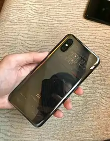 The Xiaomi Mi 8 EE features a transparent back which appears to show the working internal components of the phone. A controversy occurred over allegations that the visible internals are not the actual components of the phone but merely a sticker.[4][5][6]
