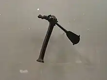 The paramount chief's authority was most signified by coiled rings around his ankle and arm that contain fibers and a sacrificial tendon wrapped in copper called the kazekedi or lukano.[6]:10[7]:39–40 Another great signifier of chiefly rulership is the mbeele phoko, a double sided sword that is sheathed in a phallus shaped wood and hide sheath that embodies the founding ancestor and signifies the chief's role in maintaining order and securing food as well as his powers over life and death. It is only unsheathed in the special occasions of execution and warfare.[6]:10[7]:40 The authority of the nobles was established by tsala, beaded hats form the top of which juts out a cone embellished with a tuft of feathers. Tsala are differentiated by the colors of their feathers. Tsala zi kanaangi, which had white feathers signify a higher rank than tsala zi nduwa, which had red feathers. White feathers could only be worn by lower rank chiefs when their superiors were not present.[8]:32 The earth chiefs wore woven raffia headpieces called bweni as their symbols of authority.[8]:32 Bewni commonly had between one and three crests running from the front to the back of the head.[7]:66 Bweni must be worn throughout day and night as they were communal charms that protected from wicked influences.[6]:9–10 [8]:32 These headpieces required the use of a headrest, called musaw or m-baambu, as they were also worn as charms while sleeping.[6]:10 These headrests were used to support the head just below the ear while one lies on their side. The headrests were carved from a single piece of wood and commonly featured imagery of a leopard, antelope, human, or a house with a pitched roof.[7]:70 To prevent from wicked influences many Yaka headrests had charms that were either inserted into a premade cavity or attached to them to protect the owner from wicked influences while they slept.[6]:10