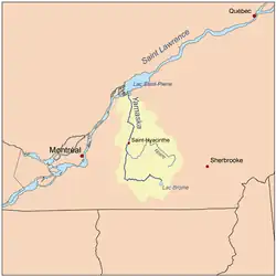 Sourcing water within the Eastern Townships, it ends its journey in Lake Saint-Pierre where it is a tributary to the Saint Lawrence River; altogether it is 177 km (110 mi) long. Crossing nearly twenty municipalities in its course, it is intrinsically linked to life around it as it is a primary source of fresh water where it passes; due to human use and adaptation, the river and its banks have become heavily altered over time, beginning around the time the first European settlers arrived to modern days.
