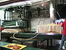 A handle, located on the first floor, controls a trap door on the bottom of the hopper, which allows the fruit to fall through to the first floor chute. On their way down the chute, the apples are chopped into small pieces, about four bushels at a time, and are then placed in a special nylon blanket. This process continues until up to 12 blankets are stacked on top of one another. The layers of chopped apples are on a large turntable that rotates under the apple press. The press used at Yates Cider Mill is called a ‘screw press’ because large screws turn to make the press go down, putting 50 tons of pressure on the blankets of chopped apples for 15 minutes. As the press goes down on the blankets, the cider comes through the weave in the cloth leaving the seeds, peelings and pulp inside the blanket. All by-products are then discarded down a chute in the floor and into a small railroad car under the mill. Periodically, the car is transferred to the dump area. The cider then flows from the press to chilled mixing tanks. From there, the cider is filtered to remove any and all small apple particles. UV treatment is the last step before bottling.[1] In one autumn weekend, the mill juices over half a million apples and can produce 300 gallons of cider an hour.[2]