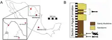 Specimens of Yehuecauhceratops were recovered during excavations from 2007 to 2011 in a locality near the town of La Salada, in Ocampo, Coahuila, Mexico,[1] about 23.3 kilometres (14.5 mi) south of Big Bend National Park in Texas. The rocks exposed in this locality belong to the Campanian Aguja Formation, although its precise location within the temporal range of the formation is difficult to establish.[2] Specimens attributed to Yehuecauhceratops are stored in the palaeontological collection of the Museo del Desierto.[1]