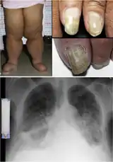 Yellow nail syndrome, also known as "primary lymphedema associated with yellow nails and pleural effusion",[1]: 849 is a very rare medical syndrome that includes pleural effusions, lymphedema (due to under development of the lymphatic vessels) and yellow dystrophic nails.[2] Approximately 40% will also have bronchiectasis. It is also associated with chronic sinusitis and persistent coughing. It usually affects adults.[3][4]: 665 [5]