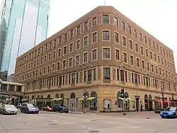 Unique to the design of the building is making each of the four facades as if it were the front facade. Typically, commercial buildings were designed to have a street facade that would be the most attractive and welcoming side because it was assumed that other sides would be hidden by adjacent construction. The facades of the Young–Quinlan building look the same with arched windows, columns and decorative elements giving each side the appearance of being the entrance side of the building. A parking garage, a modern innovation for the time, was also included in the construction of the building.[1] The building was clad with rusticated Kasota limestone on the first floor, with brick walls above and stone pilasters and columns surrounding windows. The interior has a marble staircase, crystal chandeliers, and metalwork of iron, brass, bronze, and pewter. One distinctive feature was the last elevator in the city still operated by an elevator operator.[3]