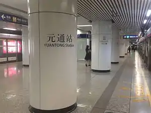 Yuantong station (Chinese: 元通站; pinyin: Yuántōng Zhàn), also known as the Nanjing International Expo Centre Station (Chinese: 博览中心), is an interchange station between Line 2 and Line 10 of the Nanjing Metro.[1][2] The Line 10 station began operations on 3 September 2005 as part of Line 1's Phase I that ran from Maigaoqiao to Olympic Stadium,[3] while the interchange with Line 2 opened when that line opened on 28 May 2010.[4] On 1 July 2014,[5] with the opening of Line 10, the former branch of Line 1 from Andemen to Olympic Stadium became re-designated as Line 10.[4]