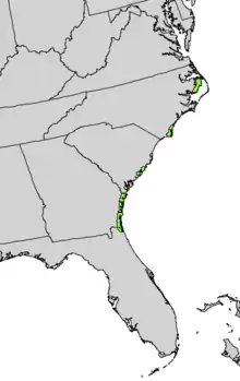 Yucca gloriosa grows on exposed sand dunes along the coast and barrier islands of the subtropical southeastern USA, often together with Yucca aloifolia and a variety formerly called Yucca recurvifolia or Y. gloriosa var. recurvifolia, now Y. gloriosa var. tristis.[10] In contrast to Y. gloriosa var. tristis, the leaves of Y. gloriosa var. gloriosa are hard stiff, erect and narrower. On the other hand, Y. aloifolia has leaves with denticulate margins and a sharp-pointed, terminal spine.