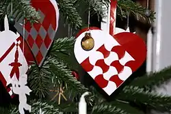 Julehjerter or pleated Yule hearts are handmade decorations which are hung on the Yule tree. Children together with other members of the family create the hearts from glossy paper in various colours. Hearts and kræmmerhuse, decorated paper cones, are often filled with treats when hung on the tree. Another traditional decoration that is put on the tree are strings with small Danish flags attached to it.