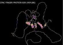 ZNF839 or zinc finger protein 839 is a protein which in humans is encoded by the ZNF839 gene. It is located on the long arm of chromosome 14.[5] Zinc finger protein 839 is speculated to pay a role in humoral immune response to cancer as a renal carcinoma antigen (NY-REN-50). This is because NY-REN-50 was found to be over expressed in cancer patients, especially those with renal carcinoma.[6][7] Zinc finger protein 839 also plays a role in transcription regulation by metal-ion binding since it binds to DNA via C2H2-type zinc finger repeats.[8][9]