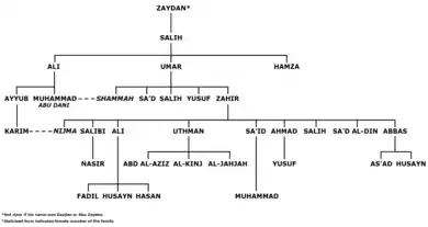 Zahir had eight sons from his wives,[155] and according to Tobias Smollett, a daughter as well.[152] His sons, from eldest to youngest, were Salibi, Ali, Uthman, Sa'id, Ahmad, Salih, Sa'd al-Din and Abbas.[155] His daughter Nijma was married to Karim al-Ayyubi,[152] who was a cousin of Zahir.[117] By 1773, Zahir had a total of 272 children, grandchildren and great-grandchildren.[152]