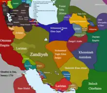 ![]() The Zand dynasty at its zenith under Karim Khan in 1776. | |||||||||||