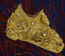 The tribe and family of Zarrin Kafsh named to be descending from Tous-Nowzar, a mythological Persian prince and hero mentioned in Zarathustra's Holy Book Avesta as well as in Ferdowsi's "Book of Kings" Shahnameh. Tous founded with his camp the settlement of the later city of Sanandaj[2] which became the Zarrin Kafsh tribe's fief, and then capital of the Kurdish Ardalan principality and finally of the Iranian province of Kurdistan.[3] Eleven generations followed Tous in the family tree and their names were Yawar, Kardank, Tiruyeh, Aubid (Avid), Karvan, Karen (Qaren), Veshapur, Nersi, Zahan, Veshapur and Sokhra.[4] Sokhra at least was the father of Gustaham, who was the first one called Zarrin Kafsh.
