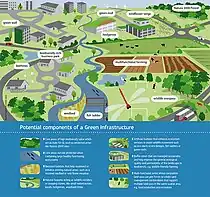 Green infrastructure includes private and public garden areas, parks, trees, and urban agriculture. Green infrastructure mitigates the effects of carbon emissions in multiple ways, by naturally removing and storing carbon dioxide, and by shading and cooling surrounding areas which reduces energy needs for cooling. The development of green space in cities, particularly long-lived trees, is a cost-effective method of carbon sequestration.[8][60] The inclusion of green space in urban areas can also help with wide variety of other issues, from stormwater[61] to mental health.[62]
