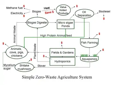 The integration of shallow oxidisation ponds of microalgae was demonstrated by Golueke & Oswald in the 1960s. The widespread global implementation of these systems can be largely credited to Prof George Lai Chan-Yu-Thim (2 March 1924 Mauritius-8 October 2016 Mauritius) from ZERI.[2] Zero waste agriculture is now practiced in China (ecological farming), Columbia (integrated food & waste management systems) & Fiji (integrated farming systems), India (integrated biogas farming), South Africa (BEAT Coop & African Agroecological Biotechnology Initiative) and Mauritius. The Brazilian government has adopted integrated farming system as a major social technology for the uplifting of marginalized and subsistence farmers through coordination with TECPAR.[3]