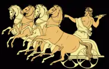 Zeus is the child of Cronus and Rhea, the youngest of his siblings to be born, though sometimes reckoned the eldest as the others required disgorging from Cronus's stomach. In most traditions, he is married to Hera, by whom he is usually said to have fathered Ares, Eileithyia, Hebe, and Hephaestus.[3][4] At the oracle of Dodona, his consort was said to be Dione,[5] by whom the Iliad states that he fathered Aphrodite.[8] According to the Theogony, Zeus' first wife was Metis, by whom he had Athena.[9] Zeus was also infamous for his erotic escapades. These resulted in many divine and heroic offspring, including Apollo, Artemis, Hermes, Persephone, Dionysus, Perseus, Heracles, Helen of Troy, Minos, and the Muses.[3]