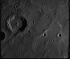 Mariner 10 image of Zola crater. Note the complex of peaks within the crater. North is up.