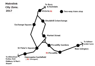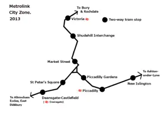 - ↑ "Metrolink : Routes : city centre routes". TheTrams. Retrieved 19 December 2016.