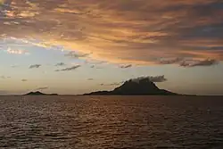 Bora Bora is an island in the Leeward group of the Society Islands of French Polynesia. The island, which is about 230 km (140 mi) northwest of Papeete, is surrounded by a lagoon and a barrier reef. In the center of the island are the remnants of an extinct volcano rising to two peaks, Mount Pahia and Mount Otemanu, the highest point at 727 m (2,385 ft). The original name of the island in the Tahitian language might be better rendered as Pora Pora, meaning "First Born"; an early transcription found in 18th- and 19th century accounts is Bolabolla or Bollabolla.