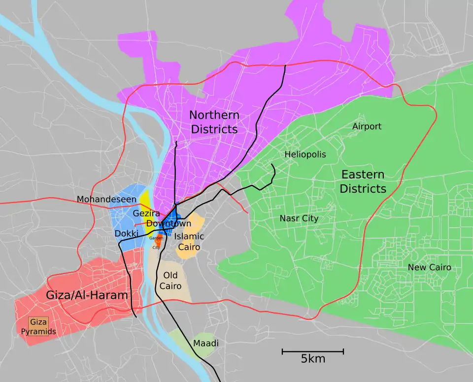 | Eastern districts A series of planned communities which have been built away from the congestion of historic Cairo. From oldest to newest, they include Heliopolis, Nasr City, and New Cairo. These areas are mostly upper-class and commercial centres. Cairo's airport is also here. |
