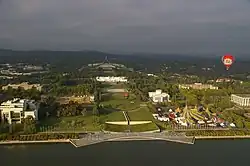 Lake Burley Griffin divides central Canberra. The central shopping and commercial area, known as "Civic", is on the north side and the parliamentary triangle and embassy area are on the south side. National institutions are likewise divided, examples being the National Museum of Australia and the Australian War Memorial on the north side and the National Library and National Gallery of Australia on the south side.