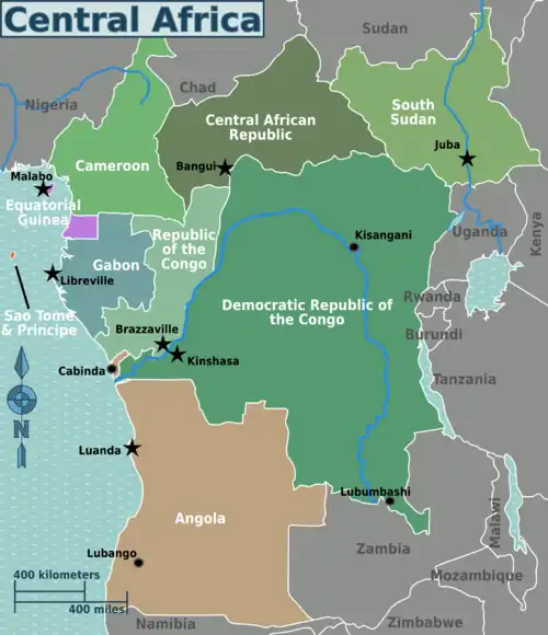 Central Africa is a region of Africa bounded by the Atlantic Ocean in the west, the African Rift Valley in the east, the Sahel plains in the north, and the Zambezi basin in the south. Rainforests cover 75% percent of the continent's regional territory, being the world's second largest after the Amazon.