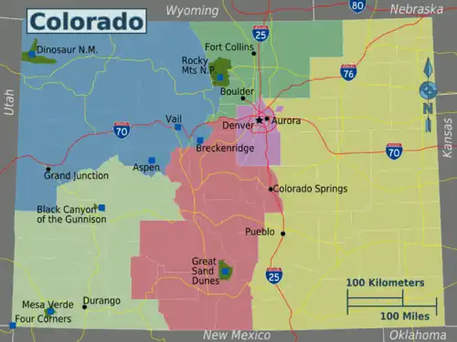 There is no universally agreed-upon breakdown of regions in Colorado. You'll often hear natives speak of a very simple structure comprised of the Eastern Slope (meaning everything east of the crest of the Rockies), or the Western Slope (everything west of the range crest), and anomalous Denver or the "valley". The breakdown below is a bit more complex, partly for reasons of style and partly because the simple east/west/Denver formulation lumps areas together that are really very disparate. It's also roughly what's used by the Colorado Department of Tourism. If you are confused by some of the boundaries, simply consult a map of Colorado counties, as many of the regions follow county lines.