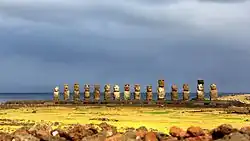 Further east is a large concentration of ahus, including the biggest one 🌍 Ahu Tongariki. with 15 moais surrounded by other archaeological remains and petroglyphs. This ahu measures almost 150 m in length and 4 m in height. Entrance with the same ticket as to the other sites that costs to enter.