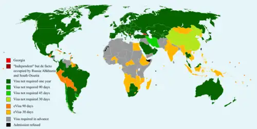 | Note: The official rules regarding visa and entrance are not always enforced by the border police. For example, some border points officially delivering visa-on-arrival may actually not deliver any (e.g., Sadakhlo/Bagratashen road border point). Furthermore, if you need a visa to enter Georgia and plan to buy one on arrival (as it is officially possible), there is no ATM at some border checkpoints (e.g., Sarpi) and, if you cannot change money into lari (e.g., no bank, or bank closed) and don't have any lari with you, you will be denied entrance; hence, it is highly preferable to ask for a visa beforehand. Finally, although EU citizens can enter with their national identity card, border guards (especially at land borders) are frequently unused to them and will check them much more thoroughly. | |