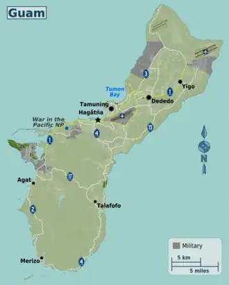 - 🌍 War in the Pacific National Historical Park - former battlefields, gun emplacements, trenches, and historic structures all serve as silent reminders of the bloody World War II battles that took place on Guam. While the park is known for its historical resources, the warm climate, sandy beaches, and turquoise waters attract visitors and residents. See Pacific War for background.