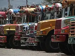 The most common option are the second class buses (chicken bus, camionetas, autobuses de parrillas, polleros, mini-bus, microbus); the more ubiquitous are the decommissioned U.S. school buses painted in all sorts of funky colors and patterns. Other second class buses exist in a Toyota Coaster mini-bus, a smaller Toyota "HiAce" van (referred to as "microbus" or "minibus") or a pick up truck (picop) or some similar type of vehicle that functions the same way as the "chicken bus". Second class bus routes are more frequent and reach more places for a cheaper fare than first class pullman but they also take considerably longer to travel over longer distances (such as from Todo los Santos to Guatemala City) with multiple stops and maybe multiple transfers. They are the most common way for most to travel in and they get crowded with everything and everyone crammed in. Large cargo and luggage usually get placed on and tied to the roof, including live chickens going to market, hence the term "chicken bus". To a visitor riding along, the bus may appear to be full but to the driver and his ayudante (helper or conductor) there's always room for another person even if the space is just a sliver between two people. If it's physically impossible to squeeze on more people there's always room up on the roof or cling on from the outside as the bus barrels down the road. The chicken buses operate from a central bus terminal (Terminal de Autobuses) which usually is nothing more than open lot next to an informal market with no ticket offices. You just walk into the lot, hop on and grab a seat. Once the bus is underway and start picking up others along the streets an ayudante will eventually come around to collect the fares (usually Q10 per hour) and he's usually very good at knowing who paid and giving change, which may not come right away. Check with fellow passengers on what the fare is to a particular destination as it may be more or less than Q10.