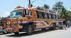 In Port-au-Prince, most routes cost 10 gourdes ($0.25). They are also quite convenient as they will stop anywhere along the route: simply yell "merci!" to get the driver to stop. However, they are sometimes overpacked and can be quite dangerous to ride in the mountain roads where the road conditions are less than ideal. First time travellers who do not speak conversational Creole are advised not to travel by tap-tap without assistance. There are also school bus versions of tap-taps used for longer voyages. These are often modified school buses.