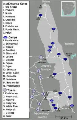 - 🌍 Phalaborwa Gate (on the R71 east of the town of Phalaborwa), ☏ +27 13 735 6509. North of Hoedspruit, Phalaborwa gate is the closest gate to Limpopo's major population centres in Polokwane and Tzaneen. The nearest main camp is Letaba.