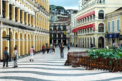 - 🌍 Senate Square (Largo do Senado) (halfway point along Av de Almeida Ribeiro). A colorful typical Iberian town square, this is the traditional heart of Macau city, complete with the traditional Portuguese pavement. It is surrounded by pastel-coloured neo-classical buildings, most of them having an administrative function during the Portuguese era. The place is a popular venue for public events and crowds gather here just to soak in the atmosphere and socialise.