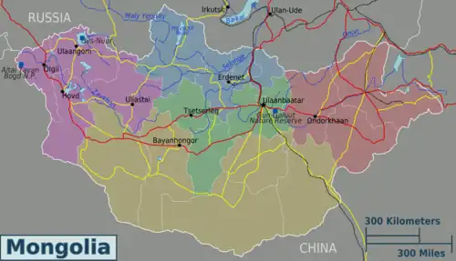 - 🌍 Ulaanbaatar (Ulan Bator, Mongolian: Улаанбаатар) – the capital city and starting point for most travel in this country. Half the population lives here.
