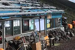 - 🌍 Fujisan Hotel (Kawaguchiko 8th Station), ☏ +81 555-22-0237. The largest hut on the mountain, with space for about 500. In two separate but nearby huts, it's a far cry from a hotel, but unlike most others English is spoken here.