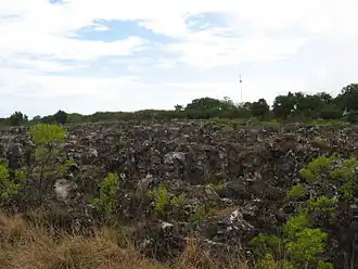 - 🌍 Command Ridge (follow the road opposite the Od-N-Aiwo hotel for about 700 m, then when you reach the top of the ridge turn left and walk along the phosphate pinnacles to the far end of the clearing; the ruins are a short distance into the forest). During World War II, Nauru was occupied by the Japanese military from August 1942 until their surrender at the tail end of the war in the wake of three years of near-continuous Allied air raids. Today, rusting relics from this era are scattered throughout the island — disused Japanese pillboxes line the shore every couple of kilometres, and old cannons can be seen along roadsides barely hidden by forest or even in plain sight between homes. However, for those who want a firsthand look at Nauru's World War II history, Command Ridge (Nauruan: Janor) is the place to go. As the island's highest point, rising to an elevation of 63 m above sea level, it was a natural lookout point for the occupiers — and today you'll find there a bevy of old artillery emplacements (including a pair of six-barrel anti-aircraft guns still pointed skyward), the ruins of a prison complex used to hold interned Nauruan natives (who were treated brutally by the Japanese) as well as five members of the Australian military captured during the invasion, and — most impressive of all — the former communications centre, now open to visitors. The interior is not well lit, but bring in a lantern or torch and you'll still be able to make out faded Japanese writing on the walls. Even if you're not a World War II history buff, Command Ridge is one of the most easily accessed country high points in the world, lying a relatively easy 800-metre hike from the road.