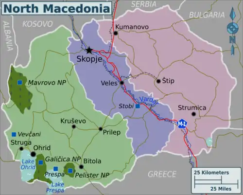 | Povardarie This central region consists of most of the area along the Vardar River, which somewhat bisects the country and defines much of this area. Skopje, North Macedonia's capital and largest city, lies in the north of this region. Veles is downstream, with the ancient city of Stobi nearby. The southern part of this region contains most of the Macedonia's wine country, in and around Kavadarci. |
