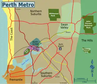 All scheduled international and domestic flights arrive and depart from 🌍 Perth Airport (PER IATA). The airport has four terminals, which for ground transport purposes can be regarded as two precincts. T1 and T2 are side-by-side to the east of the runway, while T3 and T4 are side-by-side to the west. A free bus plies between the two precincts, taking 15 min. T1 and T2 have a direct rail link to the city, with fares a flat $5. The railway station serving T3 and T4 is Redcliffe Station about 15 minutes walk from the airport or you can use the shuttle bus which leaves from a lane about 20 metres outside the T4 entrance. Public buses also serve the airport, and taxis and rental cars are available. Perth is the most important gateway to the west coast of Australia. In addition to flights from Asia, there are nonstop flights from Mauritius, Johannesburg, Auckland and London Heathrow, the latter being the first regular nonstop route between Europe and Australia and at launch the world's longest nonstop passenger flight. There are domestic flights from the largest cities in Australia and regional flights from smaller airports in Western Australia.