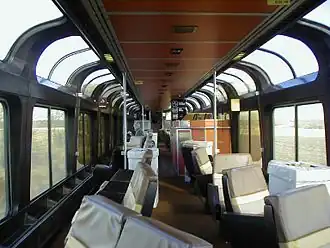Most of the long-distance trains west of Chicago include observation cars, also known as lounge cars, with very large windows to view the scenery. They are open to all passengers, whether you have a room or just a coach seat, and the seats and tables are first come, first serve.